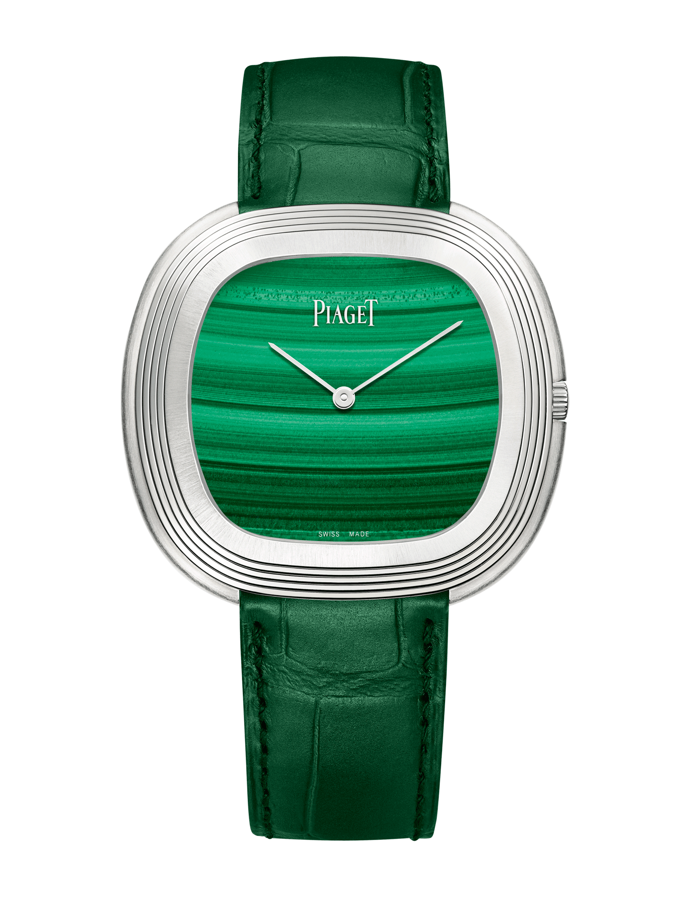 Automatic watch in white gold. Green malachite dial. Dark green alligator-skin strap. Featuring a cushion shape with rounded angles and alternating matte and shiny overlapping surfaces, this men’s luxury watch reinterprets an iconic model with a bold design worn by Andy Warhol in the 1970s. Its 45 mm white gold case features a natural malachite dial with thin gold hour markers and hands and houses the Manufacture 534P automatic movement. This sculptural Swiss watch with vintage codes and contemporary allure is exclusively available in Piaget Boutiques.