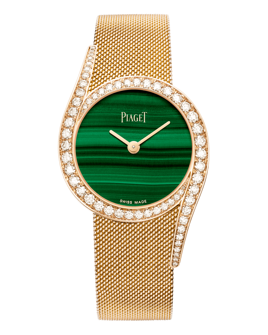 Limelight Gala watch, 32 mm. Case in 18K rose gold set with 63 brilliant-cut diamonds (approx. 1.66 cts). Natural malachite dial. Milanese mesh bracelet in 18K rose gold. 501P1 Manufacture automatic mechanical movement.