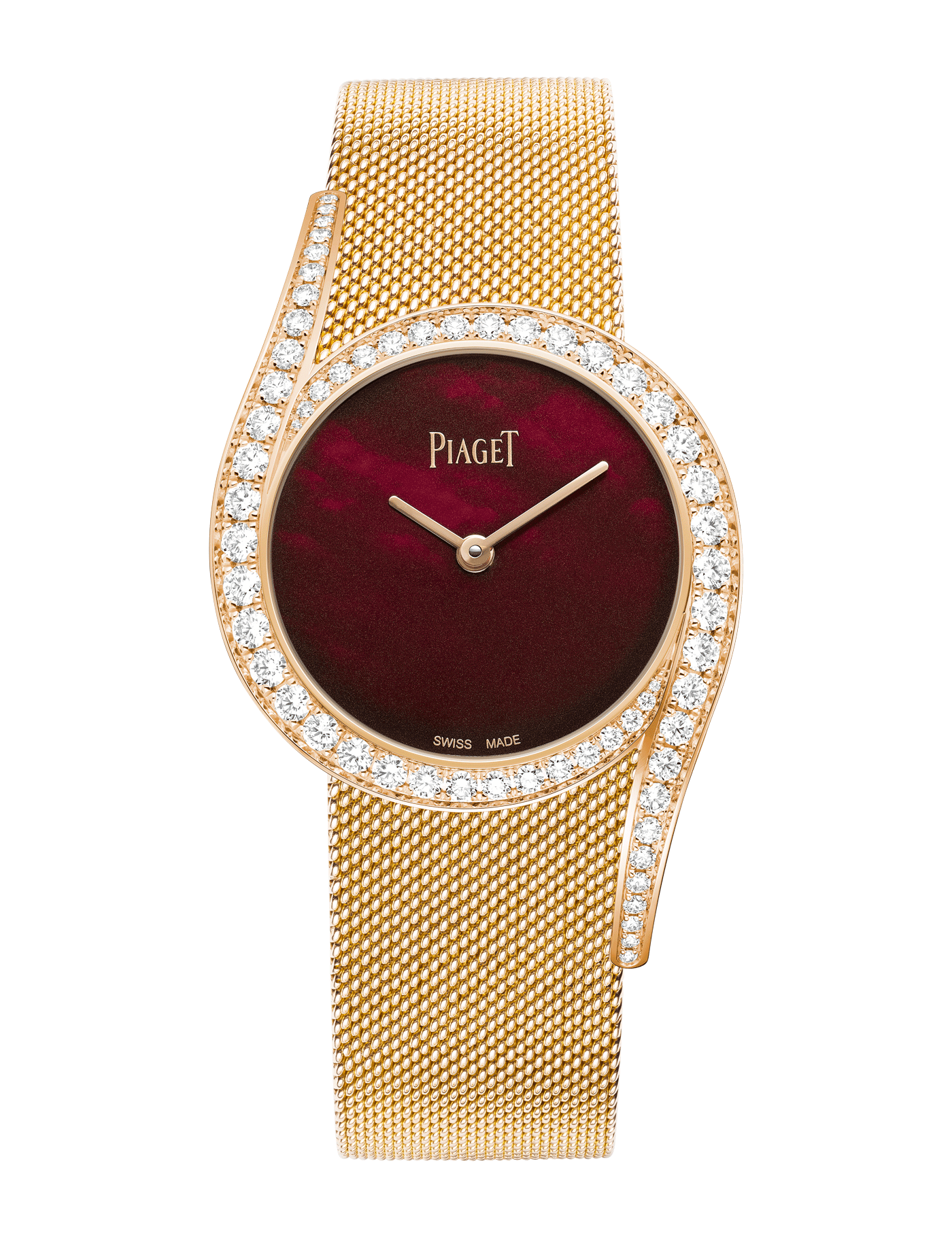 Limelight Gala watch, 32 mm. Case in 18K rose gold set with 62 brilliant-cut diamonds (approx. 1.65 cts). Mother-of-pearl and translucent deep burgundy lacquered dial. Milanese bracelet in 18K rose gold. Buckle set with a brilliant-cut diamond (approx. 0.01 ct). 501P1 Manufacture automatic mechanical movement.