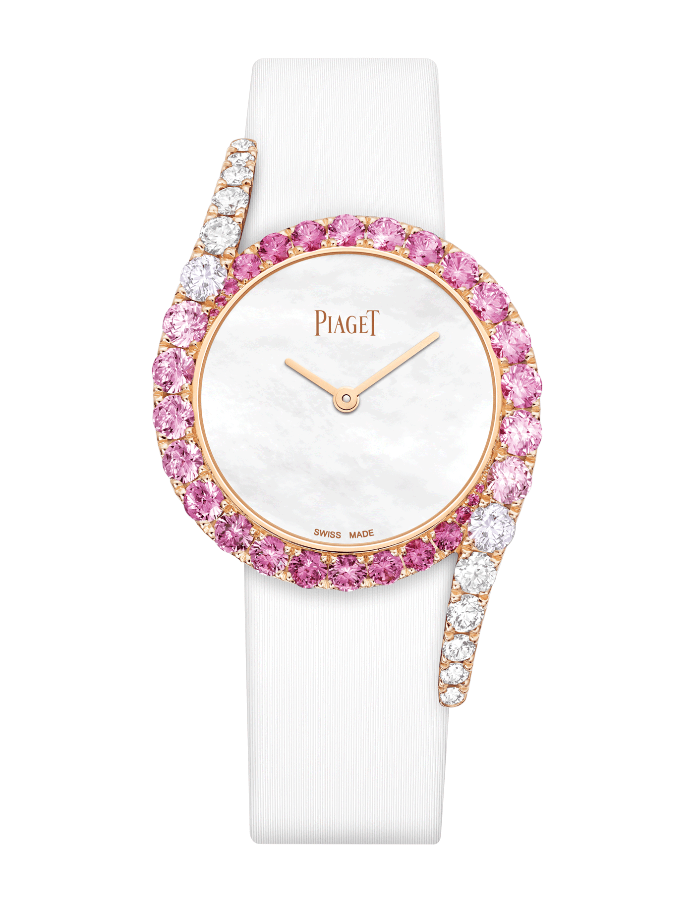 Limelight Gala Precious watch, 32 mm. Case in 18K rose gold set with 10 brilliant-cut diamonds (approx. 0.90 ct) and 32 pink sapphires (approx. 4.70 cts). White mother-of-pearl dial. Buckle set with 15 brilliant-cut diamonds (approx. 0.06 ct). Sapphire crystal case back. Manufacture 501P1 automatic mechanical movement. Limited edition of 50.