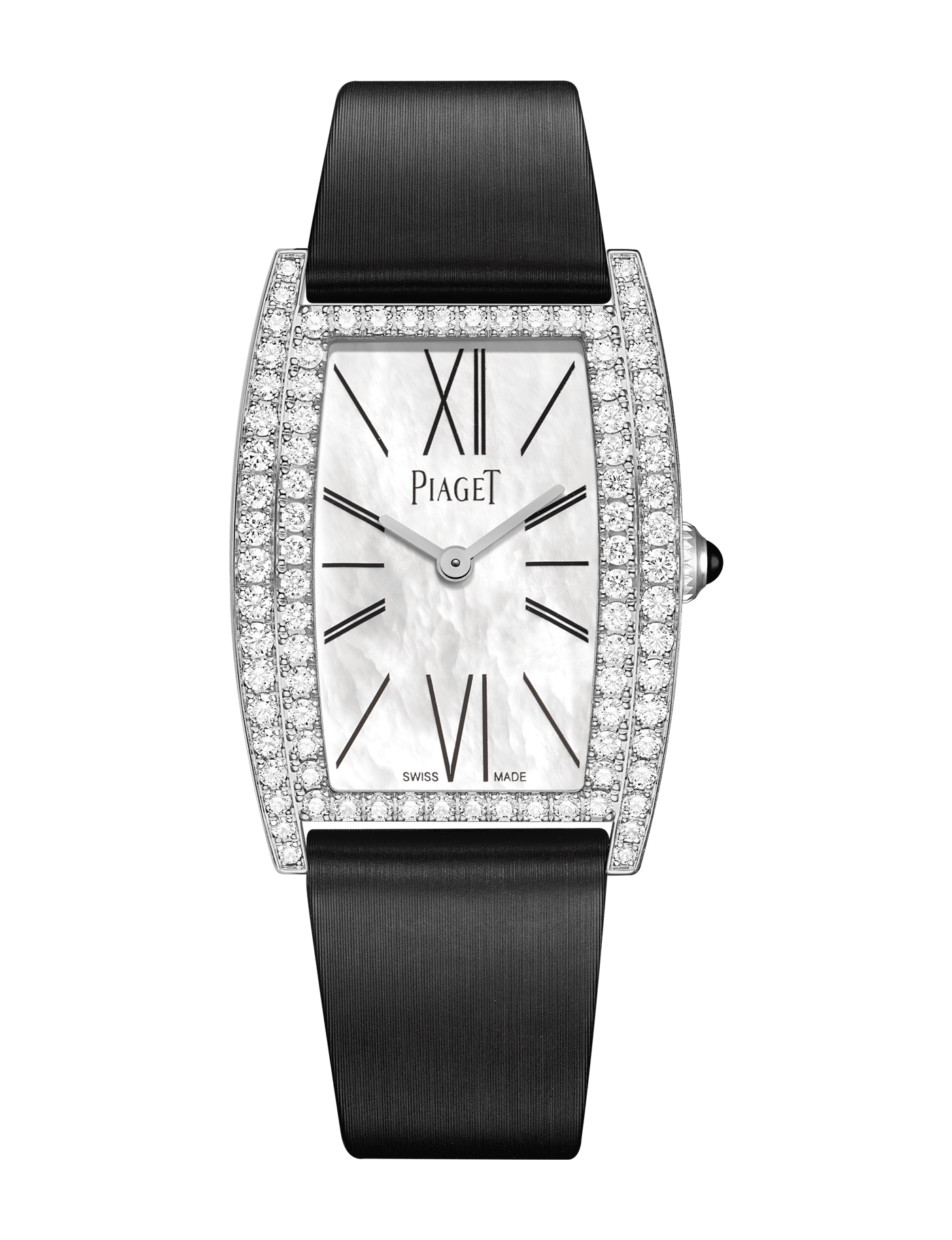 The feminine tuxedo style of the Limelight tonneau-shaped watch, which unfurls its elegant treasures on every occasion with its two rows of 86 diamonds set either side of the white gold case. On its white mother-of-pearl dial, slender black Roman numerals and hour markers measure the passing hours to the rhythm of the 438P caliber, an ultra-thin hand-wound mechanical movement that is only 2.1 mm thick. Piaget has embellished this exclusive mechanism with traditional finishes, visible through the sapphire crystal case back: circular Côtes de Genève, circular-grained bottom plate and bridges, beveled bridges and blued screws.