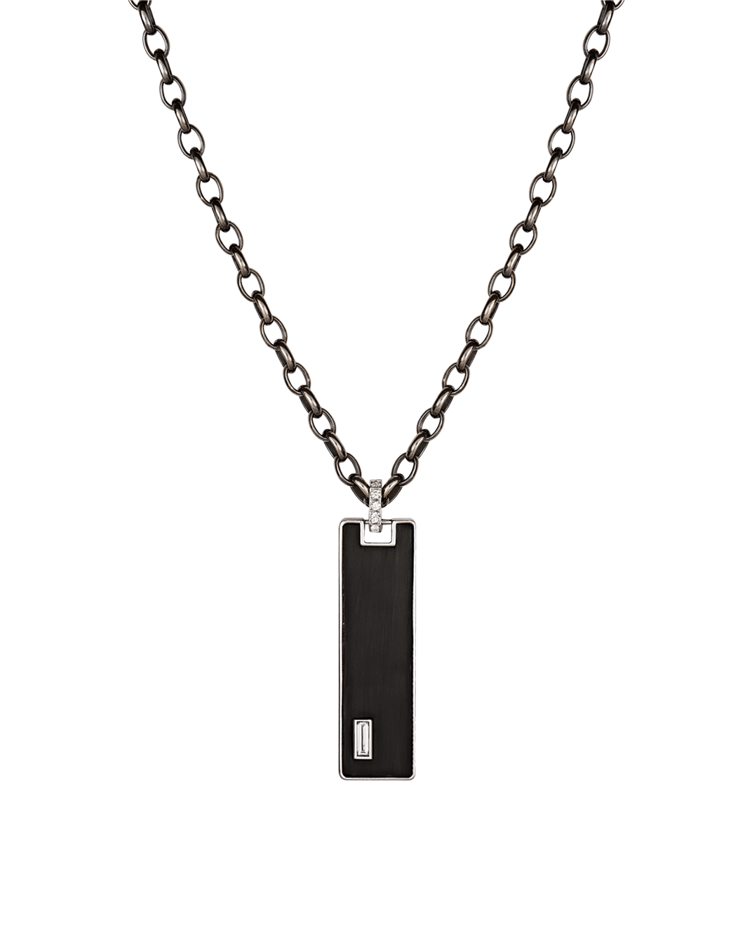 Molu Baget Pırlantalı Siyah Karbonlu Kolye: 18 Ayar Beyaz Altın ve 925 Ayar Gümüş olarak tasarlanan kolye, baget pırlanta ve siyah karbonun güçlü uyumu ile minimal bir şehir şıklığını yansıtıyor.