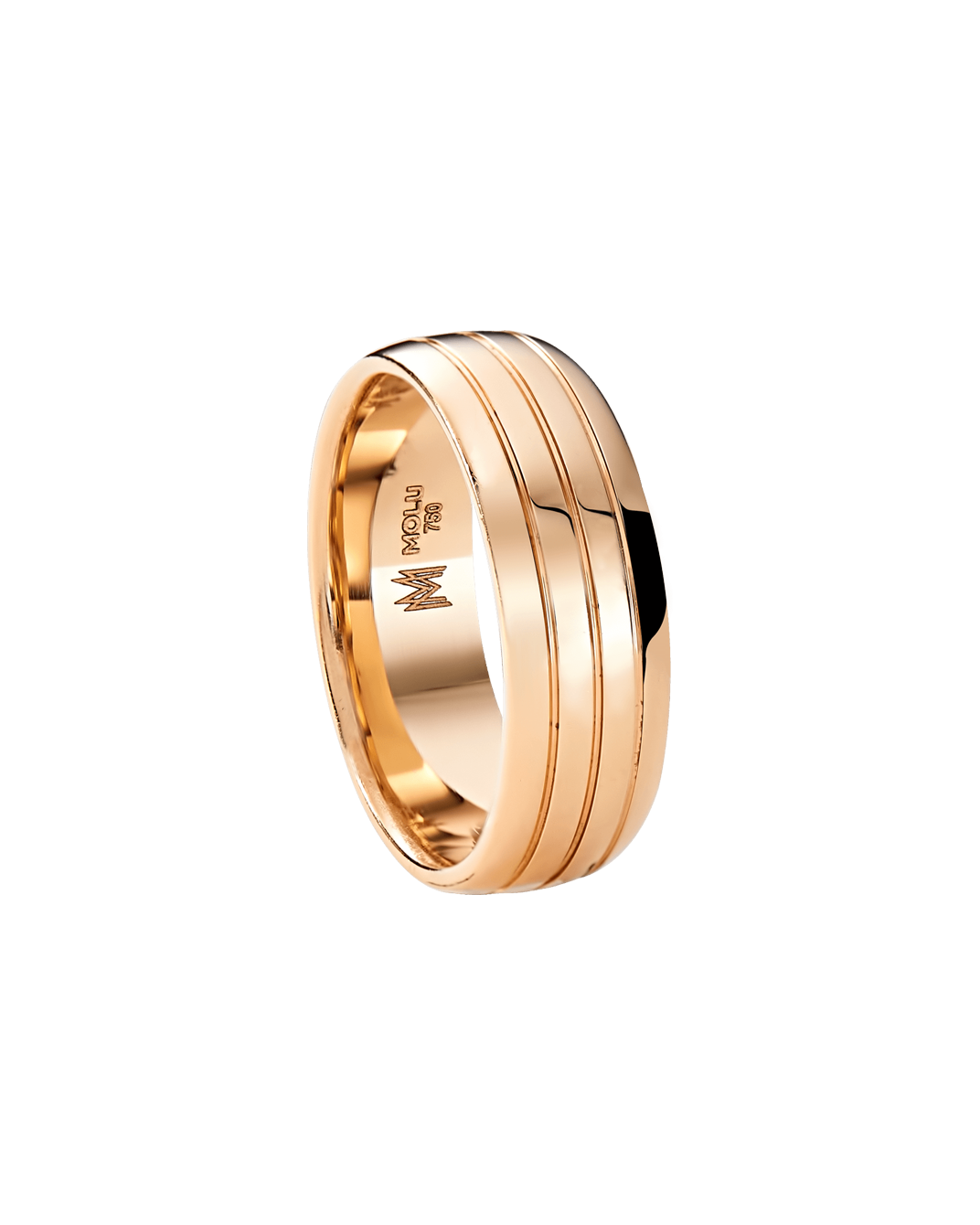 Molu Bombeli Üç Kanallı Alyans: 18 Ayar Pembe Altın olarak tasarlanan alyans, klasik bombe stiline eklenen üç kanallı görünümü ve Molu’nun el işçiliğindeki ustalığı ile modern bir ambiyansa bürünüyor.