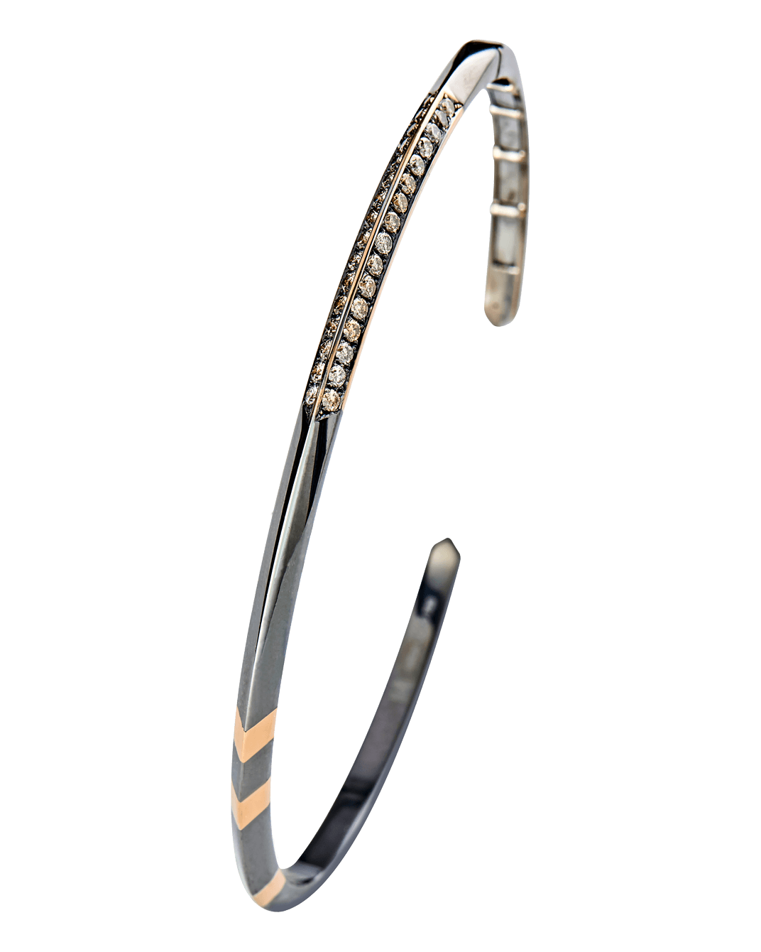 Molu Kahve Pırlantalı Gümüş Bilezik: 18 Ayar Pembe Altın ve 925 Ayar Gümüş olarak tasarlanan bilezik, kahverengi pırlantanın şık dokunuşu ile modern şehir stiline bürünüyor.