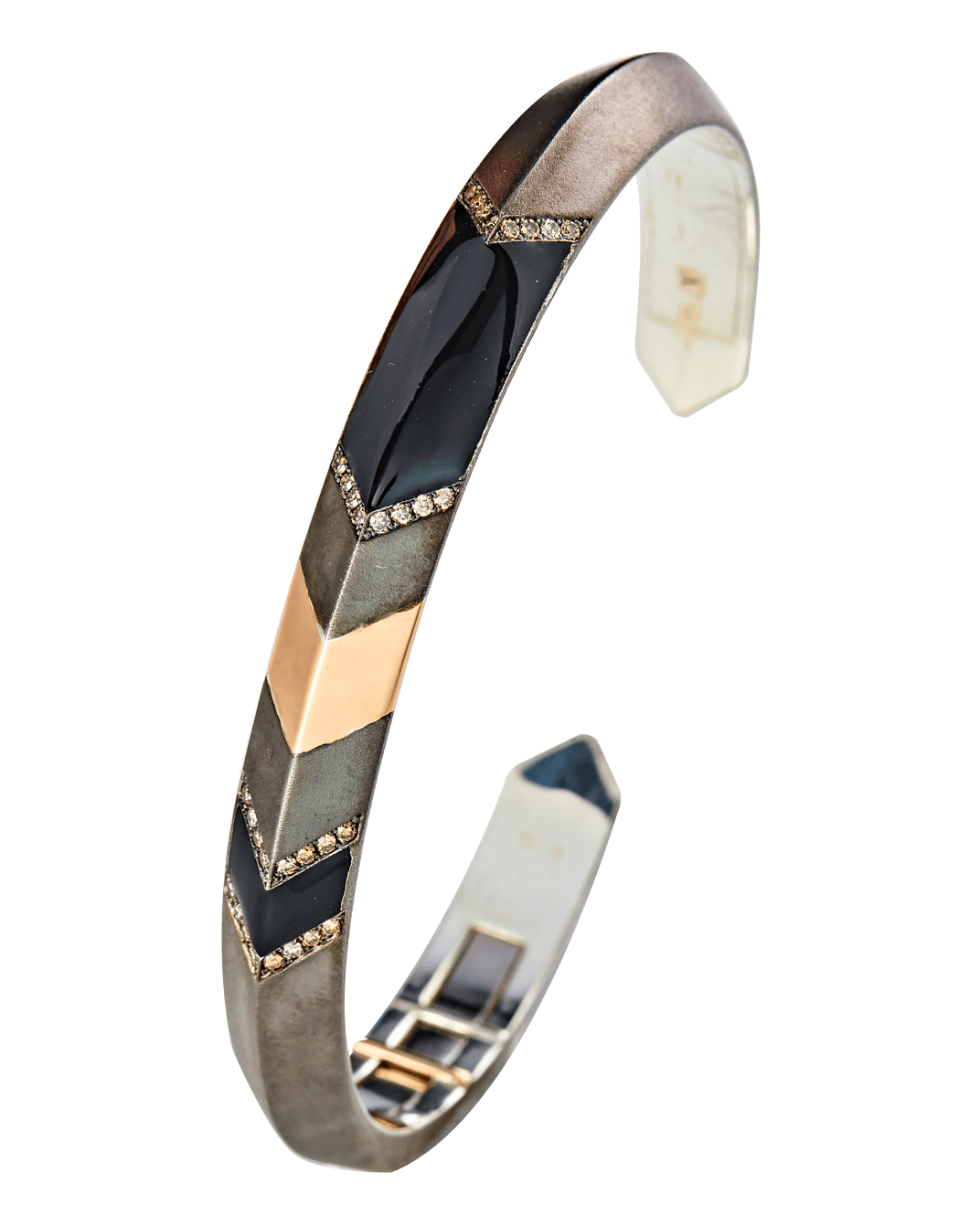 Molu Kahve Pırlantalı Gümüş Bilezik: 18 Ayar Pembe Altın ve 925 Ayar Gümüş olarak tasarlanan bilezik, kahverengi pırlanta ve Molu’nun usta işçiliği ile şehrin dinamizmini yansıtıyor.