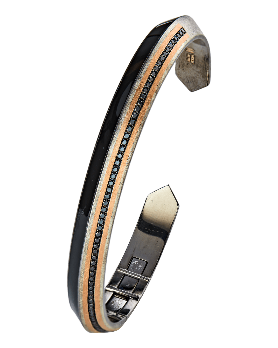 Molu Kahve Pırlantalı Gümüş Bilezik: 18 Ayar Pembe Altın ve 925 Ayar Gümüş olarak tasarlanan bilezik, kahverengi pırlantanın modern dokunuşu ile siyahın ve altının güçlü uyumunu dinamik şehir stiline taşıyor.