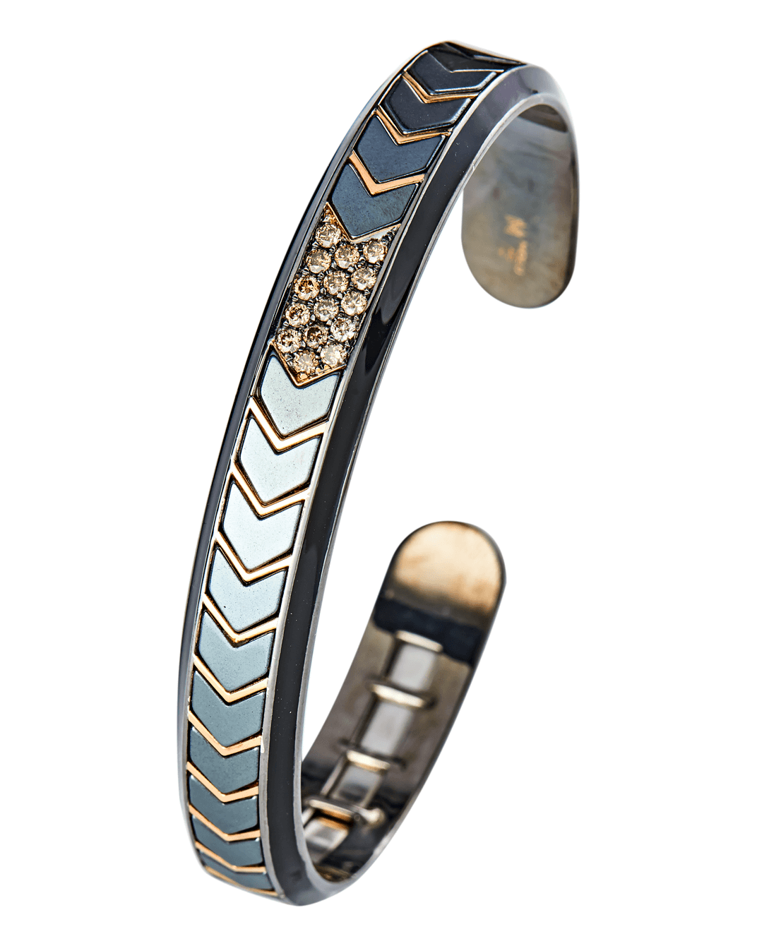 Molu Kahve Pırlantalı Hematitli Gümüş Bilezik: 18 Ayar Pembe Altın ve 925 Ayar Gümüş olarak tasarlanan bilezik, kahverengi pırlanta ve hematit taşının güçlü uyumu ile modern bir şehir şıklığını yansıtıyor.