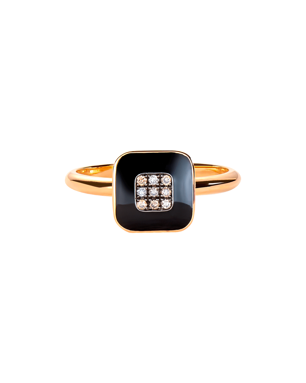 Molu Kahve Pırlantalı Siyah Mineli Kare Pave Yüzük: 18 Ayar Pembe Altın olarak tasarlanan yüzük, siyah pırlanta ve siyah mine taşının uyumu ile stilinize zarif ışıltıları getiriyor.