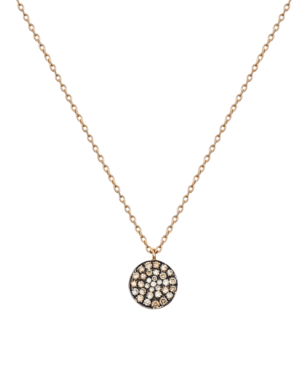 Molu Kahve Pırlantalı Yuvarlak Pave Kolye: Pembe Altın ve kahve pırlantanın sıcak uyumu üzerinizden hiç ayırmayacağınız şık ve zamansız bir kolye olarak beğeninize sunuluyor.