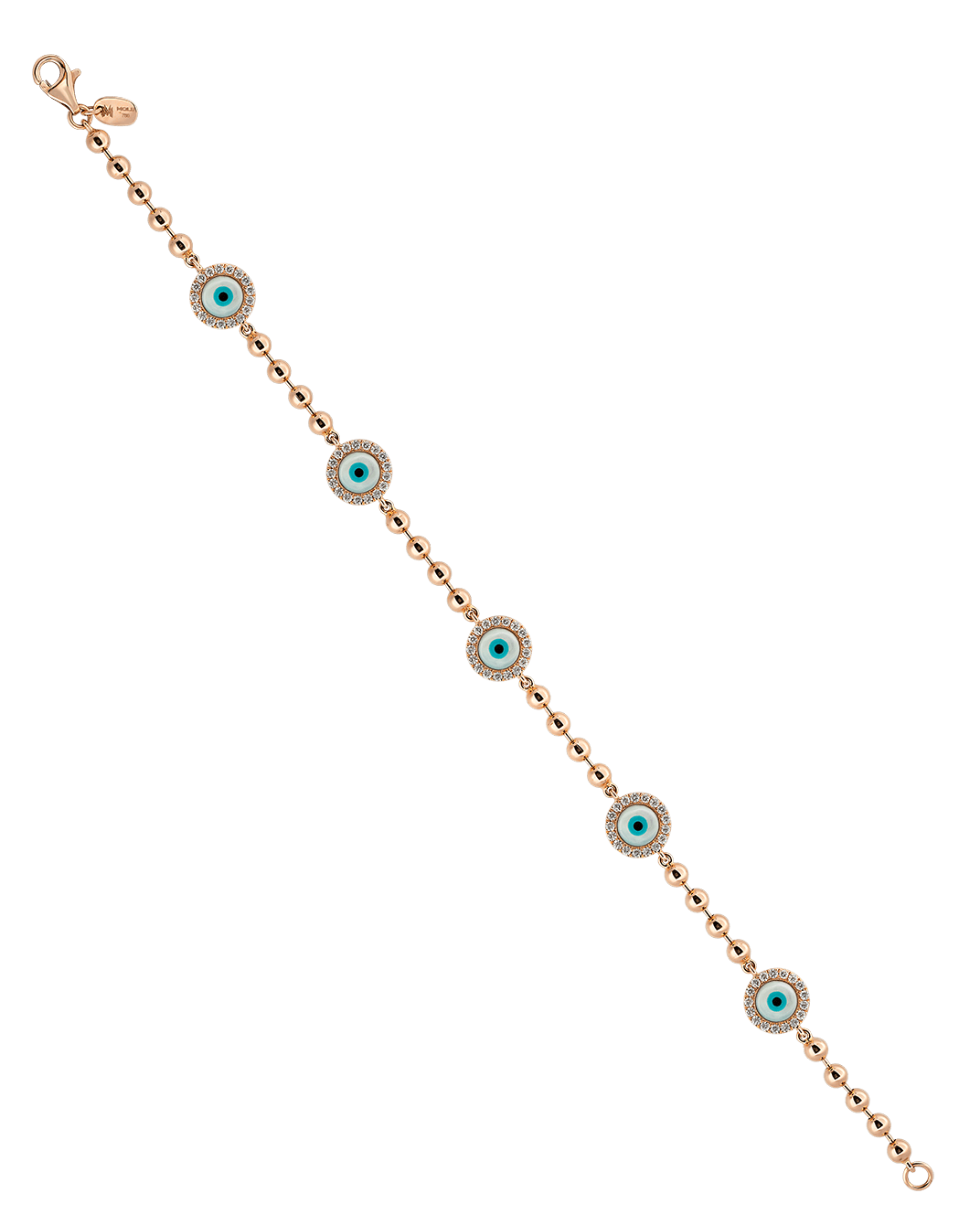 Molu Pırlantalı 18 Ayar Pembe Altın Beş Yuvarlak Gözlü Top Zincirli Bilezik