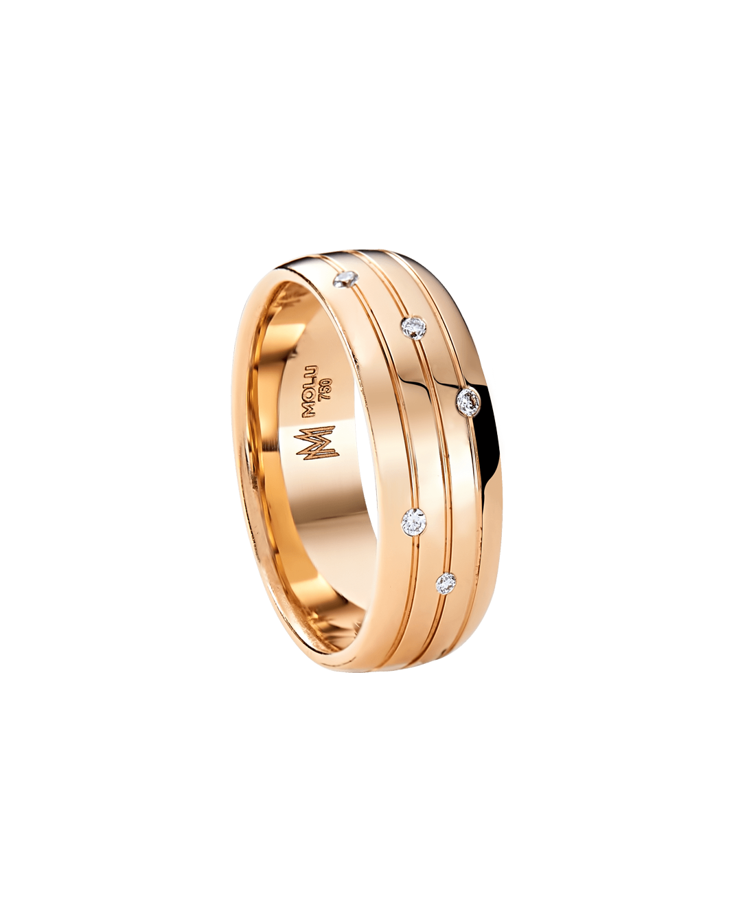 Molu Pırlantalı Bombeli Üç Kanallı Alyans: 18 Ayar Pembe Altın ve bombeli olarak tasarlanan alyans, kanallarına ahenkle eklenen Molu pırlantaları ile sonsuz zarafeti taşıyor.