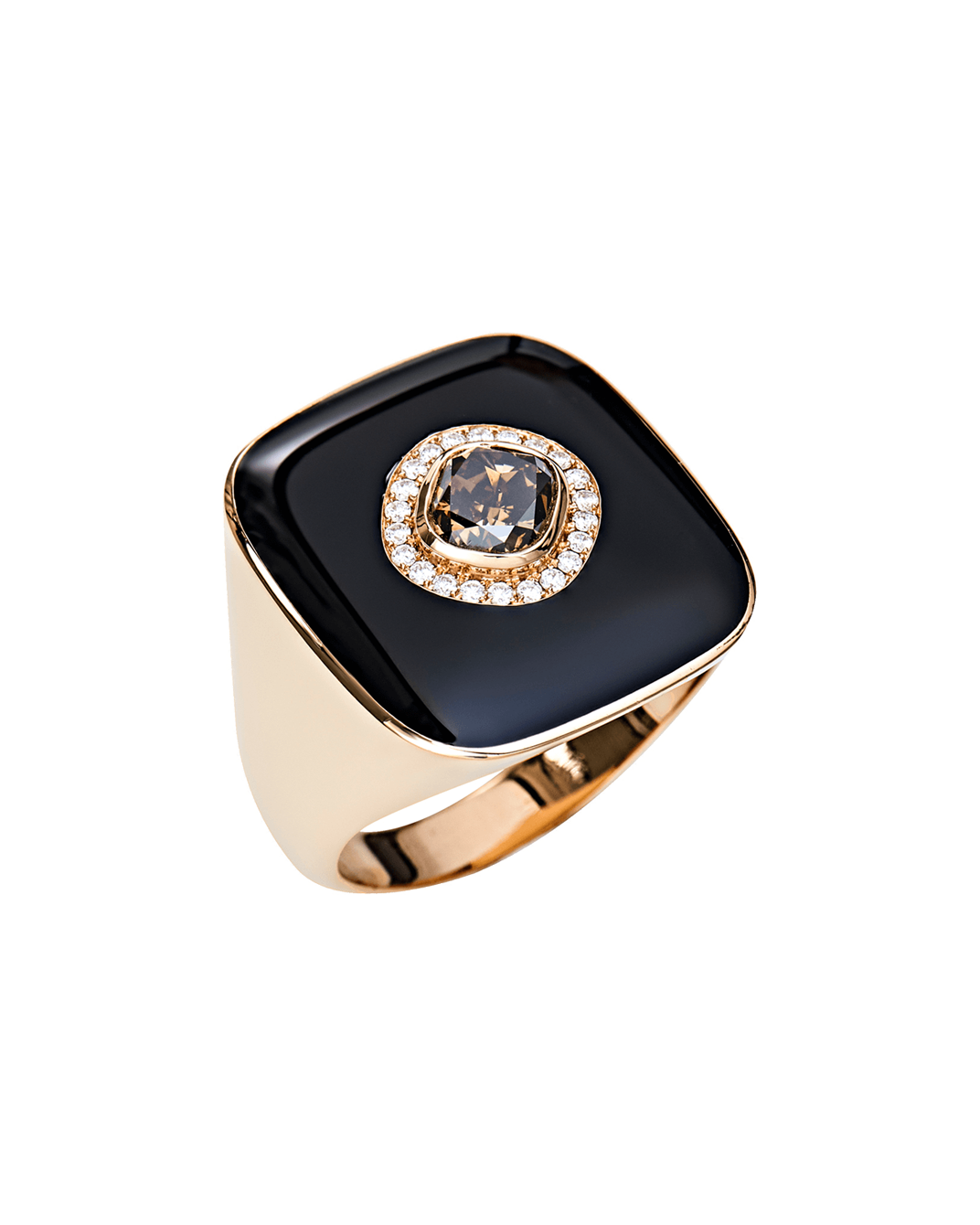 Molu Pırlantalı Kahve Tektaşlı Siyah Mineli Yüzük: 18 Ayar Pembe Altın olarak tasarlanan yüzük, siyah minenin gizemi ve beyaz pırlantaların şık uyumunu kahverengi tektaş pırlanta ile zamanın ötesinde bir şıklığa dönüştürüyor.