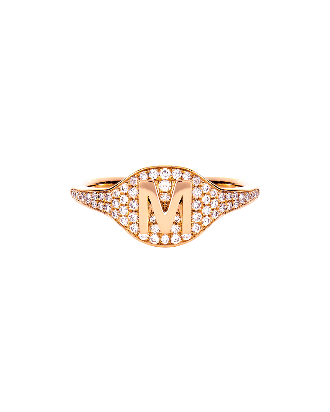 Molu Pırlantalı M Harfli Pave Yüzük: 18 Ayar Pembe Altın olarak tasarlanan pave yüzük, ‘M’ harfini Molu pırlantalarının ışıltısı ile birleştiriyor.