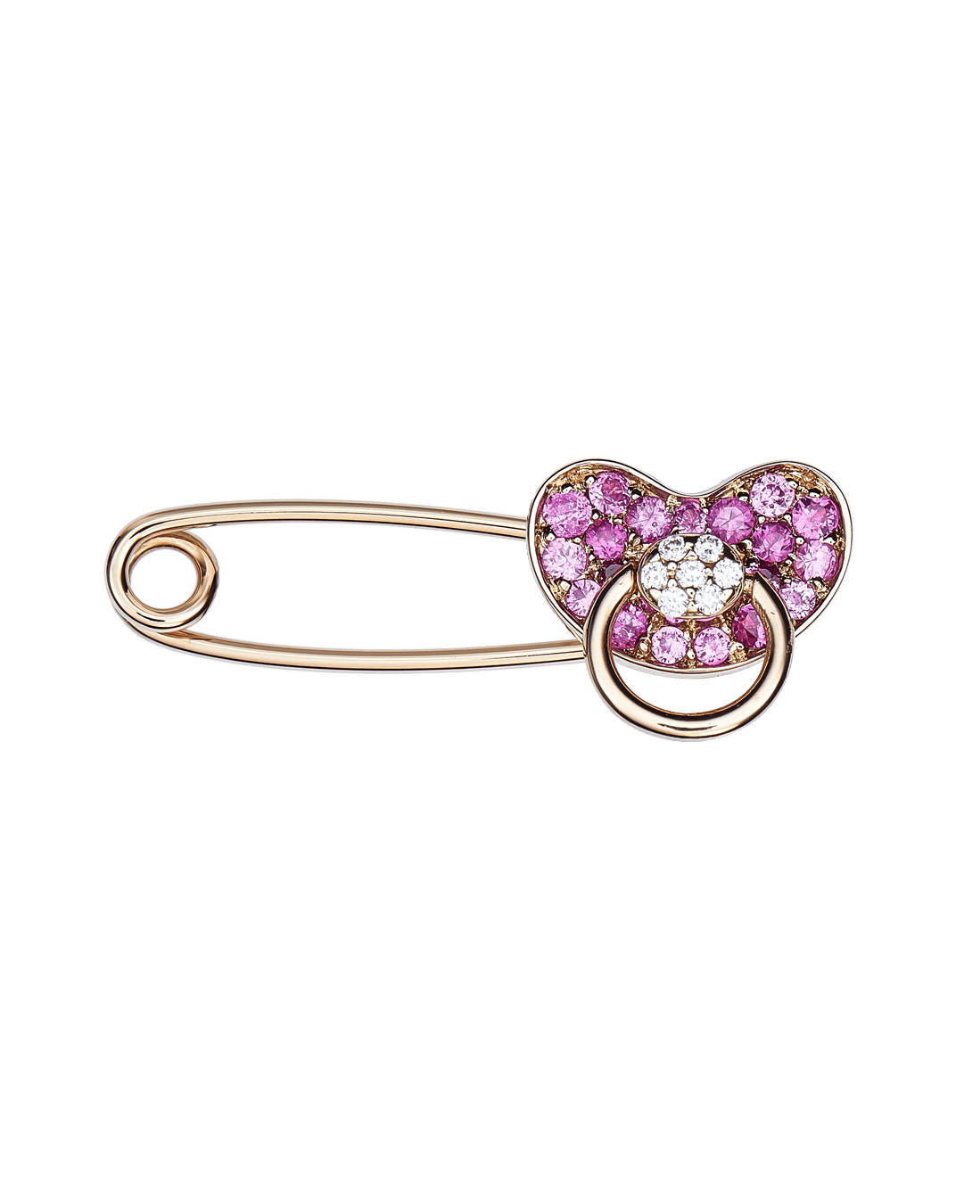 Molu Pırlantalı Pembe Safirli Çengelli İğne: 18 Ayar Pembe Altın olarak tasarlanan emzik iğne, Molu pırlantaları ve pembe safir taşının keyifli uyumu ile ailenizin gözlerindeki ışıltıyı yansıtacak. O’na vereceğiniz ilk armağanı unutulmaz kılacak.