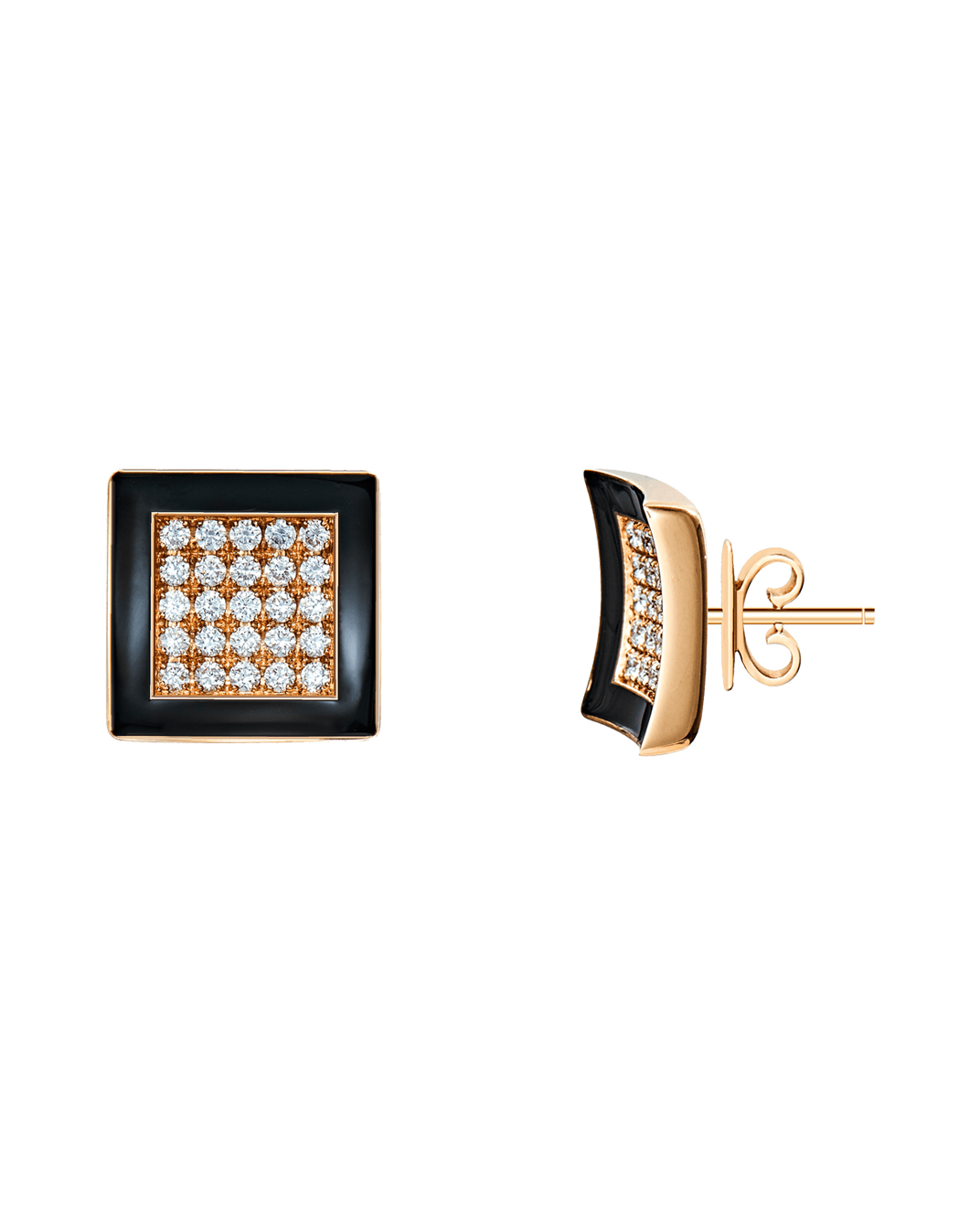 Molu Pırlantalı Siyah Mineli Kare Pave Küpe: 18 Ayar Pembe Altın olarak tasarlanan kare küpe, siyah minenin Molu pırlantaları ile yükselen uyumunu ve gizemini tarzınıza yansıtıyor.