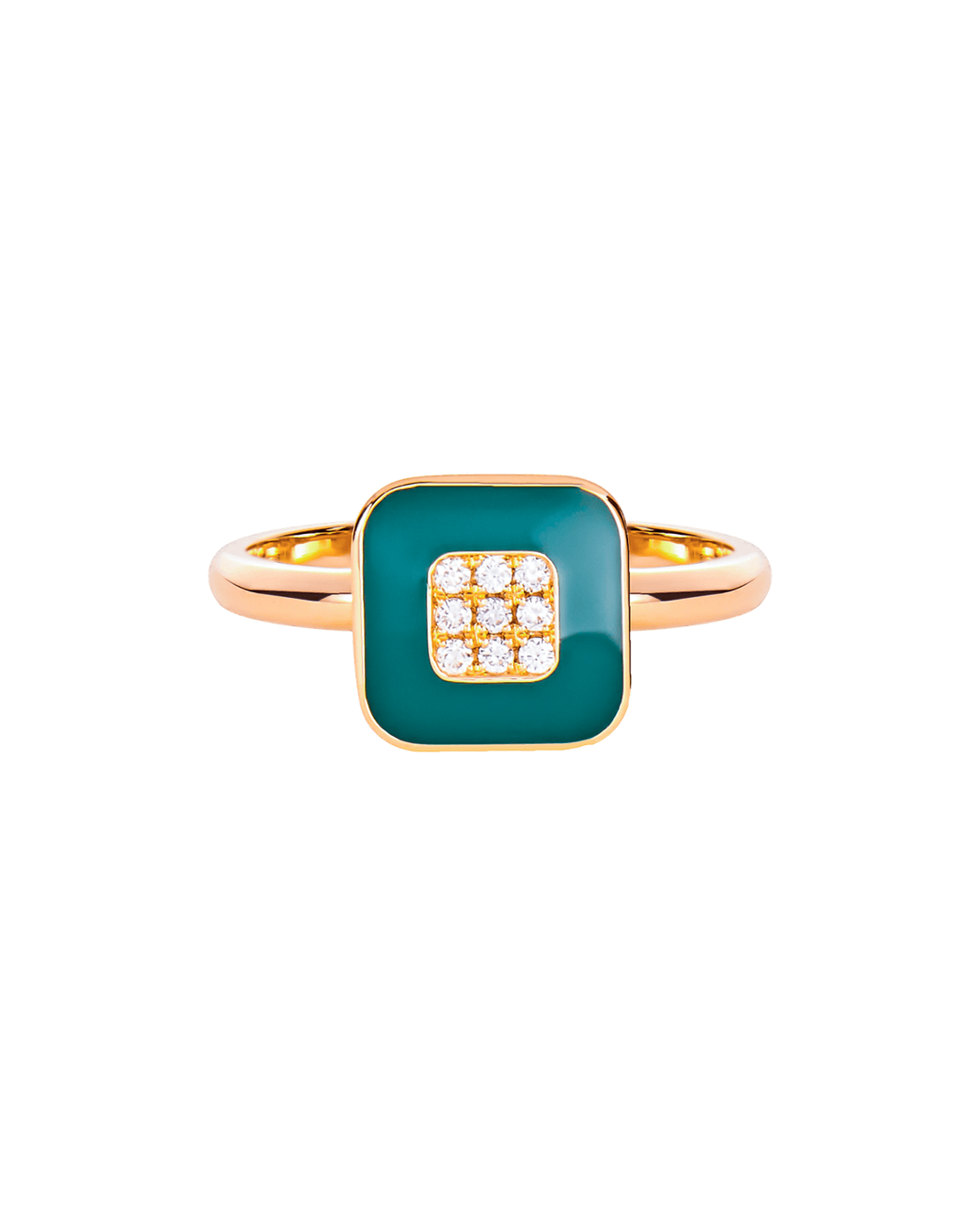 Molu Pırlantalı Yeşil Mineli Kare Pave Yüzük: 18 Ayar Pembe Altın olarak tasarlanan kare yüzük, Molu pırlantaları ve yeşil mine taşının şık uyumu ile stilinize dinamik bir dokunuş katıyor.