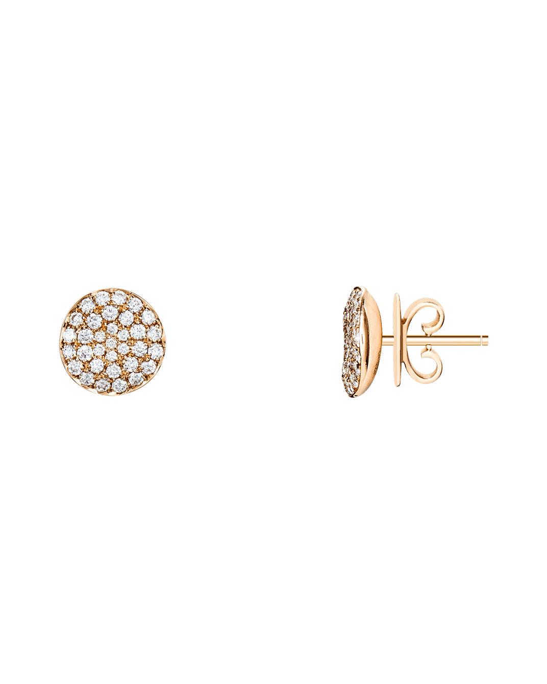 Molu Pırlantalı Yuvarlak Pave Küpe: Pembe altın ve beyaz pırlantanın zarif birlikteliği günün her anında size eşlik edecek.
