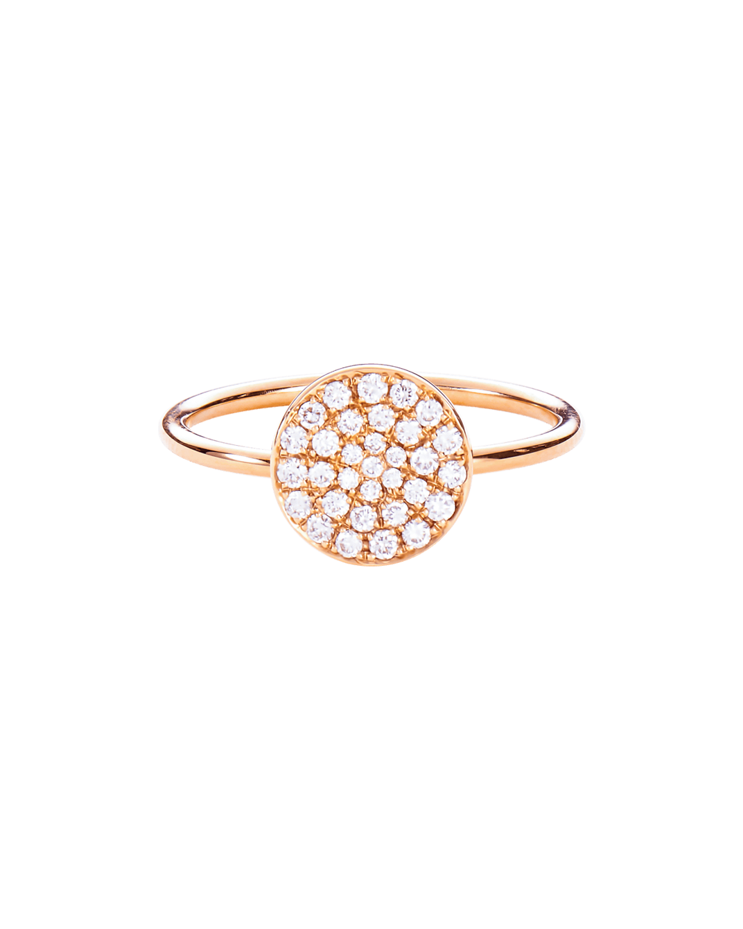 Molu Pırlantalı Yuvarlak Pave Yüzük: Pembe altın ve beyaz pırlantanın zarif birlikteliği günün her anında parmağınızda taşıyabileceğiniz bir mücevhere dönüşüyor.