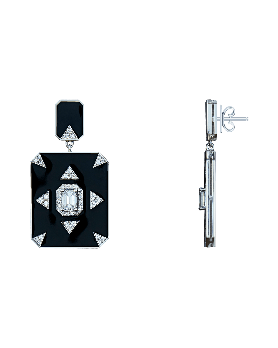 Molu Pırlantalı Zümrüt Kesim Tektaşlı Siyah Mineli Küpe: 18 Ayar Beyaz Altın olarak tasarlanan küpe, siyah minenin zarafeti ve Molu pırlantalarının eşsiz ışıltısı ile kusursuz bir mücevher işçiliğini yansıtıyor.