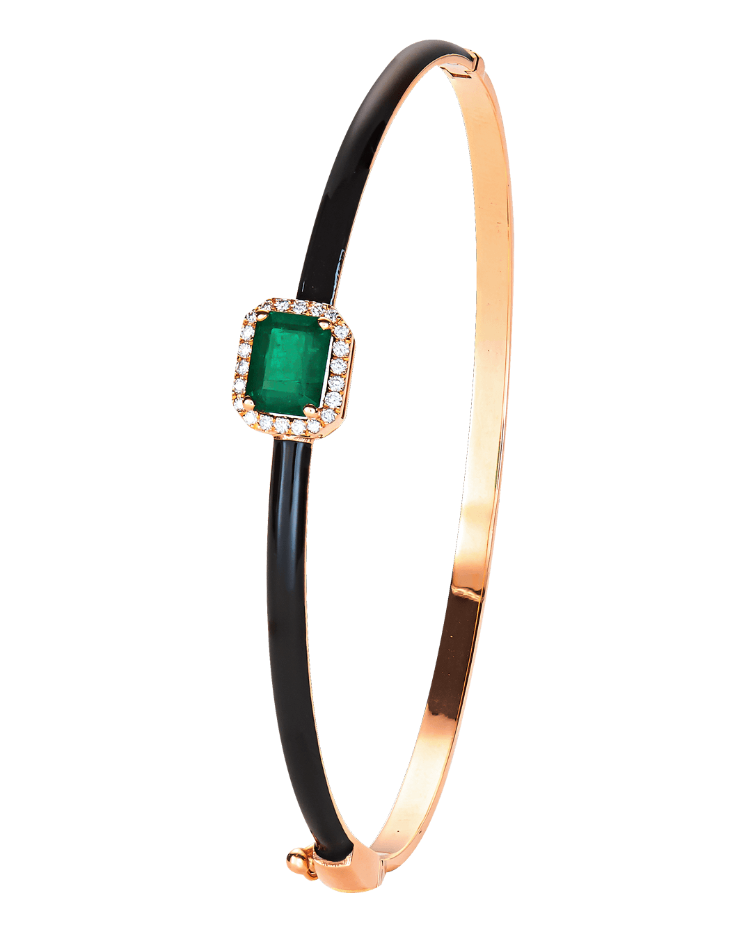 Molu Pırlantalı Zümrütlü Siyah Mineli Kelepçe Bilezik: 18 Ayar Pembe Altın olarak tasarlanan kelepçe bilezik, siyah minenin gizemi ile zümrütün zarif ışıltısını eşsiz Molu pırlantalarıyla yükseltiyor.