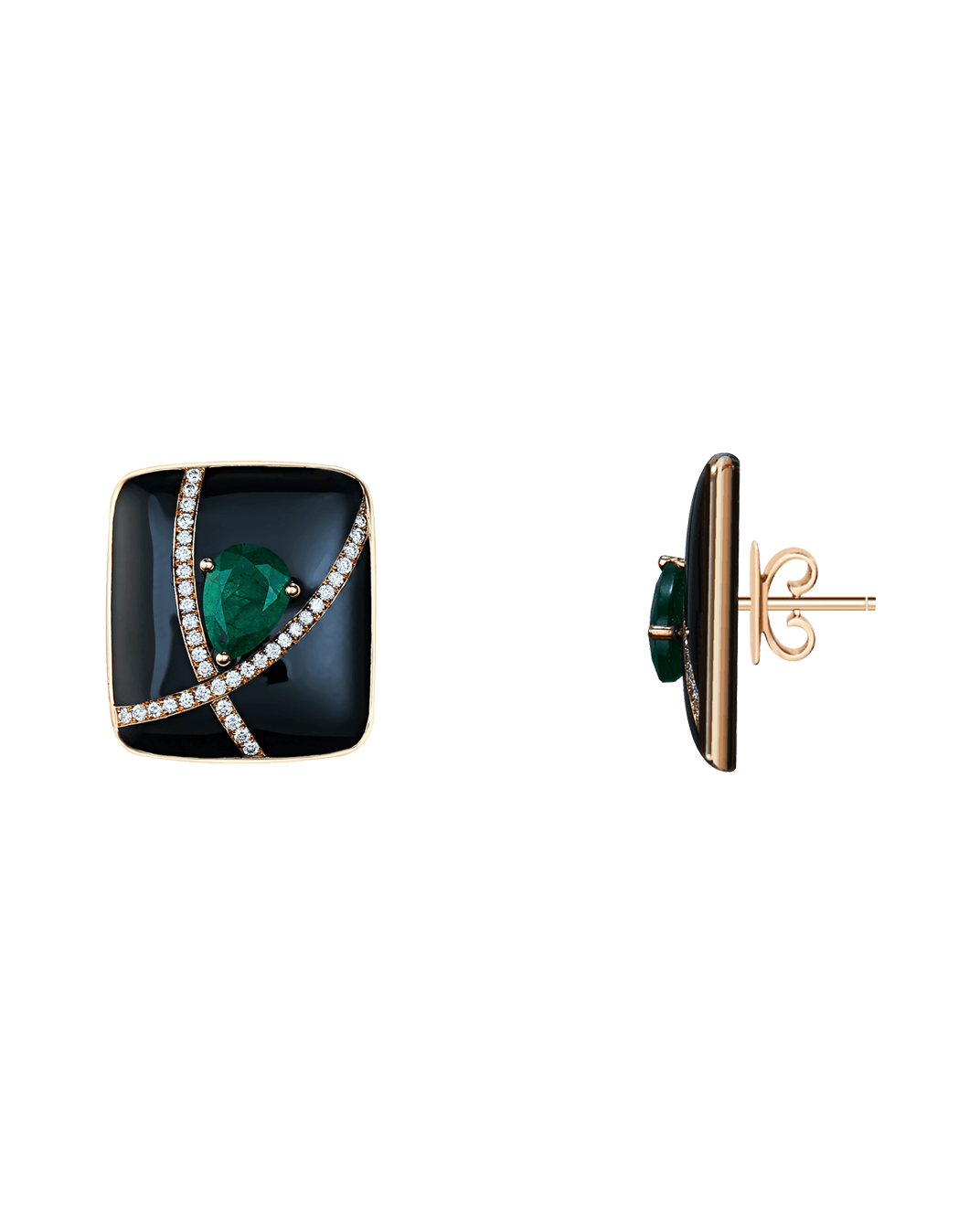 Molu Pırlantalı Zümrütlü Siyah Mineli Küpe: 18 Ayar Pembe Altın olarak tasarlanan kare küpe, siyah minenin gizemi ile zümrütün zarif dokunuşunu eşsiz Molu pırlantaları eşliğinde iz bırakan bir mücevhere dönüştürüyor.