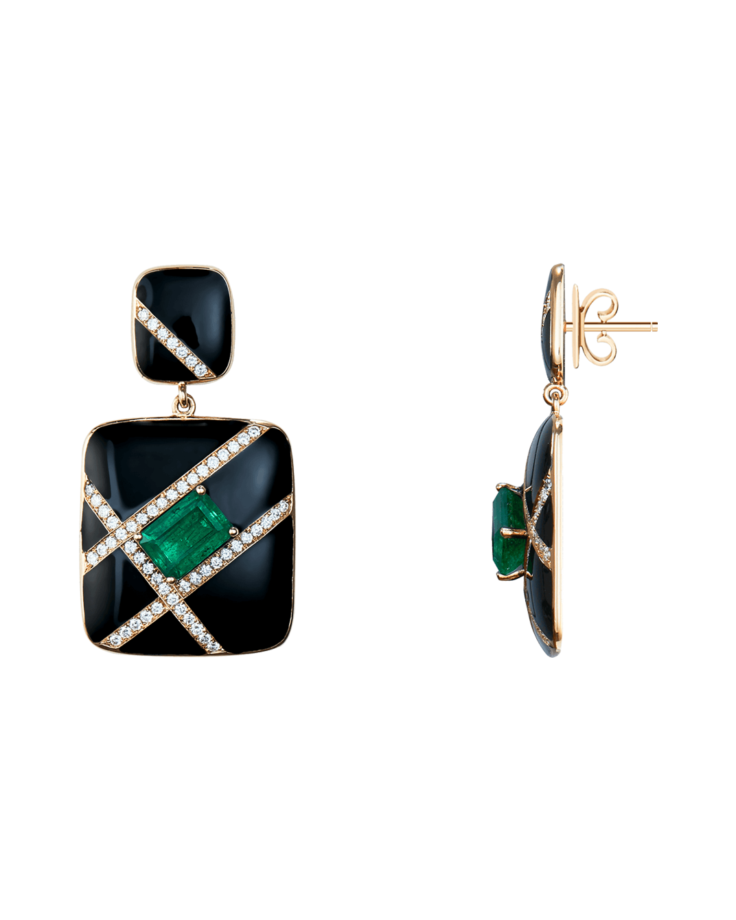 Molu Pırlantalı Zümrütlü Siyah Mineli Küpe: 8 Ayar Pembe Altın olarak tasarlanan kare küpe, siyah minenin gizemi ile zümrütün zarif dokunuşunu eşsiz Molu pırlantaları eşliğinde iz bırakan bir mücevhere dönüştürüyor.