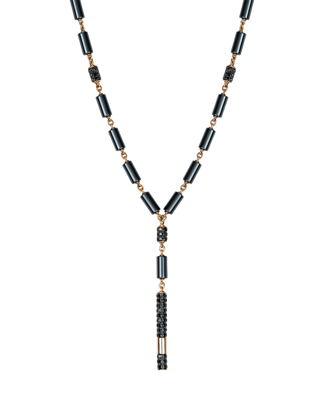 Molu Siyah Pırlantalı Hematitli Kolye: 18 Ayar Pembe Altın, siyah pırlanta ve hematit taşının güçlü uyumunu taşıyan kolye, siyahın asaleti ile modern şıklığını tamamlıyor.