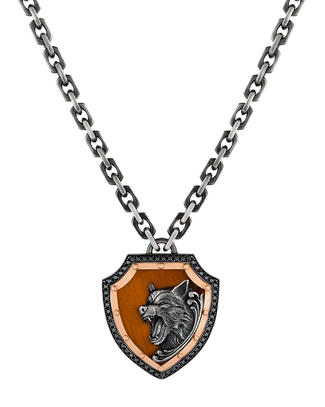 Molu Legend Siyah Pırlantalı Kurt Figürlü 925 Gümüş Kalkan Kolye