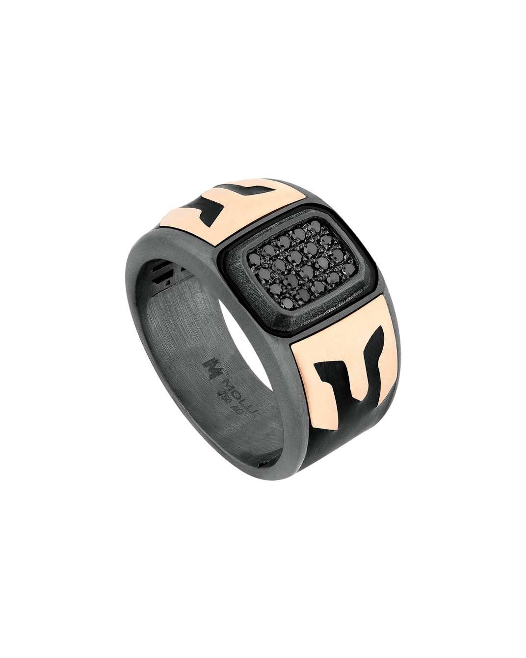 Molu Siyah Pırlantalı Siyah Mineli Gümüş Yüzük: 18 Ayar Pembe Altın ve 925 Ayar Gümüş olarak tasarlanan yüzük, siyah pırlanta ve siyah mine detayı ile güçlü ve zamansız şehir stilini yansıtıyor.