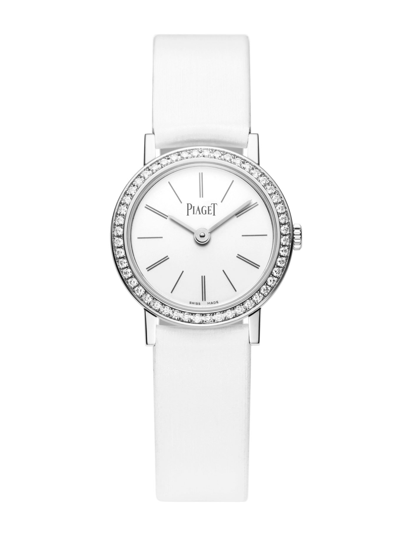 The Altiplano collection, synonymous with highly elegant ultra-thin watches, plays the femininity card in a new format. This tiny watch, with a diameter of 24 mm, displays a face denuded of all superfluous elements. On the slightly iridescent white dial, the hour markers have a particularly soft color. A circle of diamonds, set on the gold case, adds a touch of sophistication. A luxury watch for women, full of freshness, available in white gold on a white satin strap.