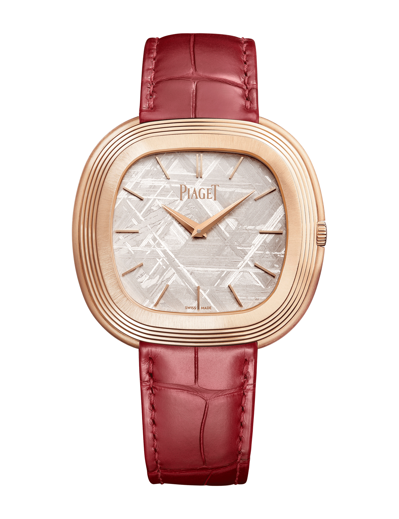 Andy Warhol watch, 45 x 43 mm. Case in 18K rose gold. Silver meteorite dial with hour markers. Dark red alligator leather strap. Manufacture 501P1 automatic mechanical movement.