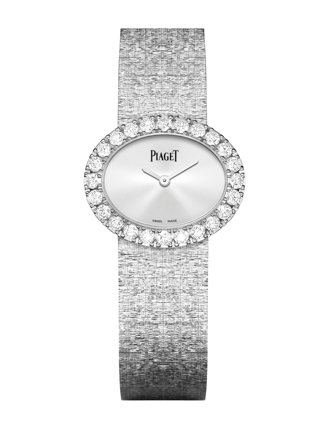 This chic, daring luxury watch is the very epitome of Piaget's boundless imagination. It continues Piaget's traditional expertise in working white gold, epitomized here in the outstanding beauty of this delicately-crafted bracelet. With its elegant hand-engraved finish, its "Decor Palace" produces an almost iridescent effect, like a ribbon of raw silk wrapped exquisitely around the curve of the wrist. Inspired by Haute Couture techniques, it is on its reverse side that the bracelet reveals all its technical virtuosity. Its multitude of assembled links creates an effect of extreme delicacy, in which each part is crafted to perfection to form a golden "fabric" of unrivaled lightness. The bracelet is fitted directly onto the case so as to merge into a single whole. The character of this jewelry watch finds its most elegant expression in its silver-plated oval dial, with its purity of lines, enhanced by the sensual gem-setting on its bezel. Its white gold and diamonds radiate from the wrist with a myriad of sparkling rays of light.