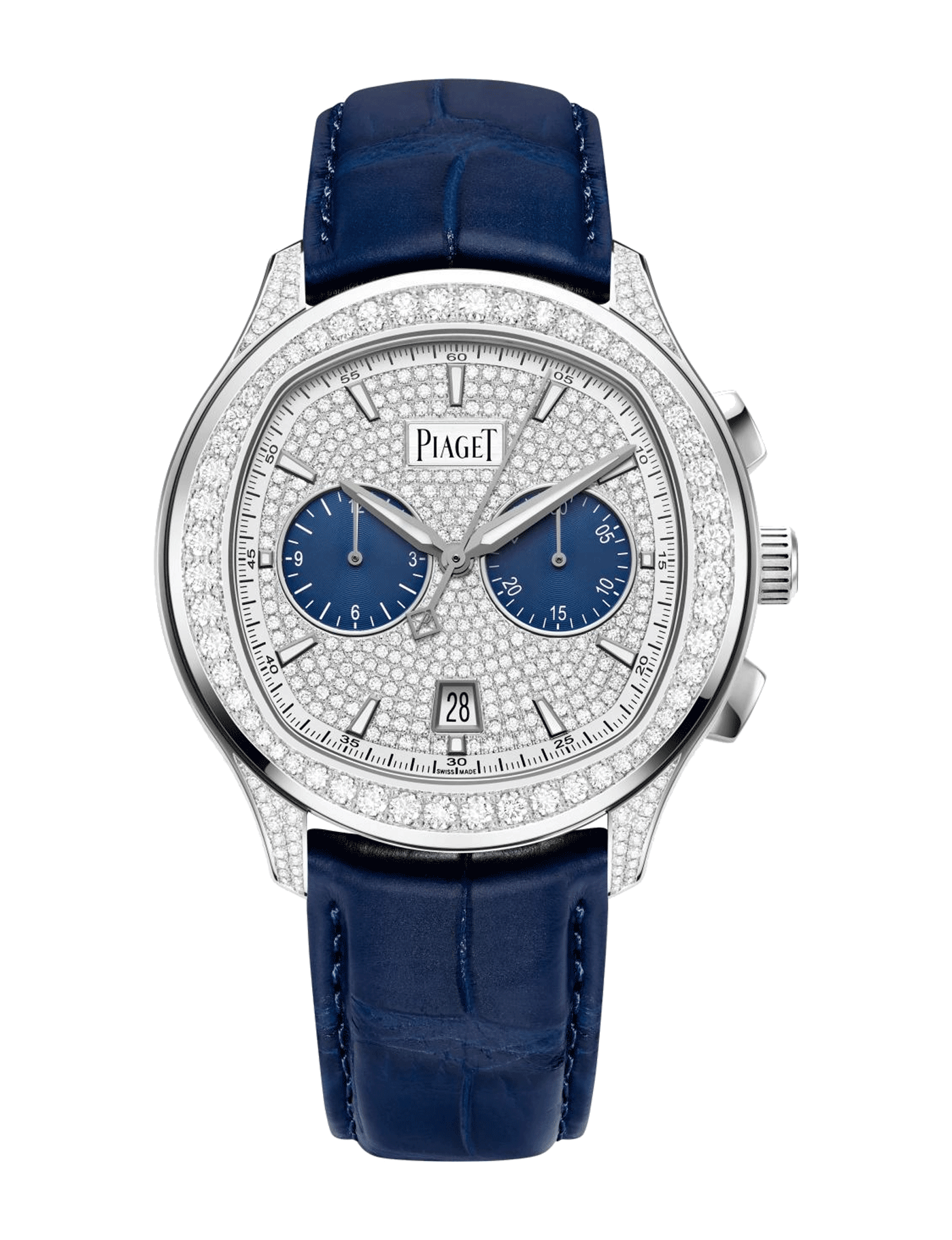 The 42 mm Piaget Polo Chronograph watch with diamonds and interchangeable strap. With a fully paved diamond dial set with blue counters, this is a magnificent reincarnation of the classic Piaget Polo. The 1160P automatic movement animates this Swiss chronograph watch, while an interchangeable alligator strap adds a dynamic element to a bold timepiece. A powerful design that captures the spirit of excellence, commitment and joy of this diamond watch for men. The contemporary white gold round and cushion-shaped dial and bezel make it the perfect companion for life’s celebratory moments.