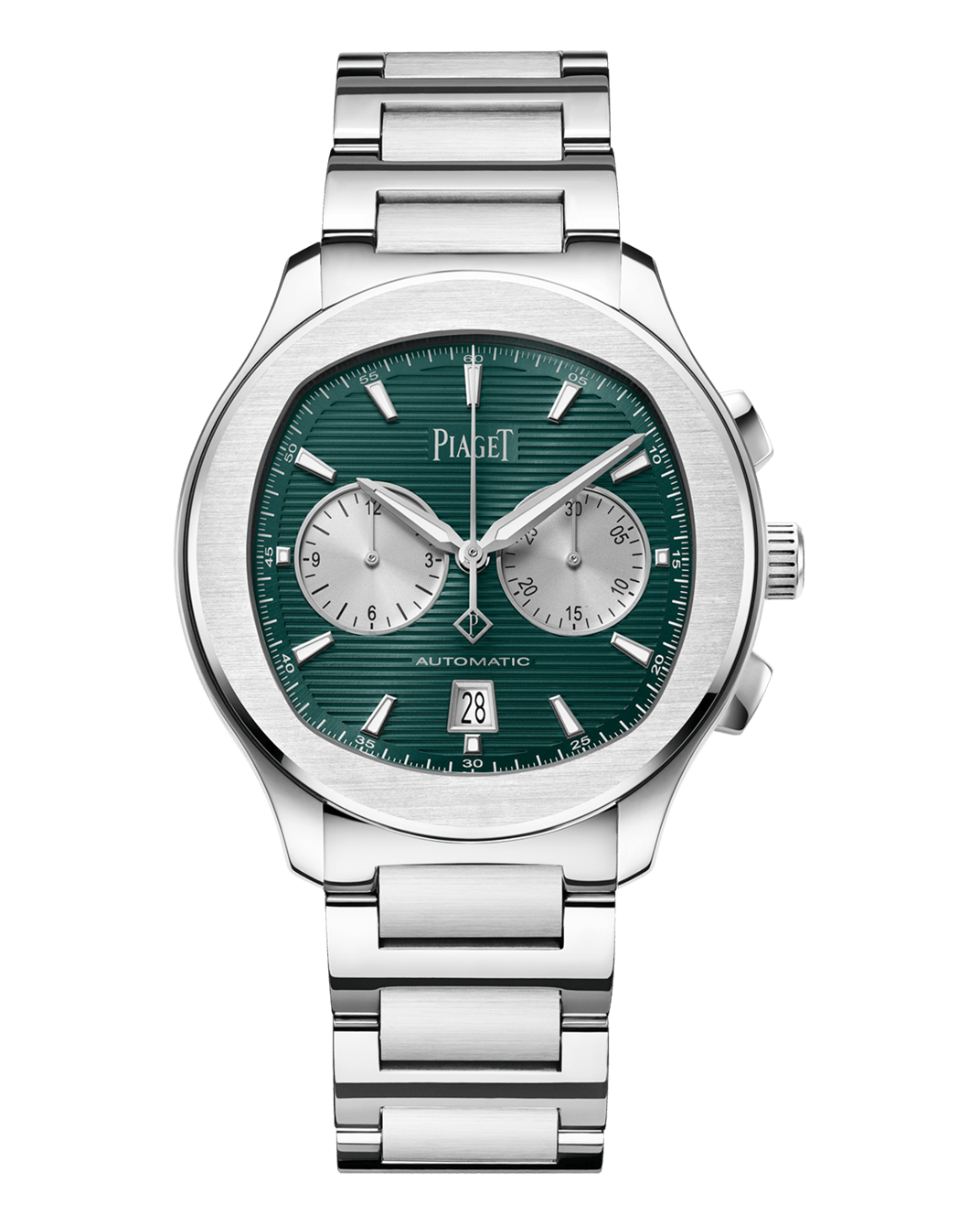 Piaget Polo Chronograph watch, 42 mm. Steel case. Green dial with SuperLumiNova® counters and indexes. Sapphire crystal case back. Manufacture 1160P automatic mechanical movement with chronograph and date.