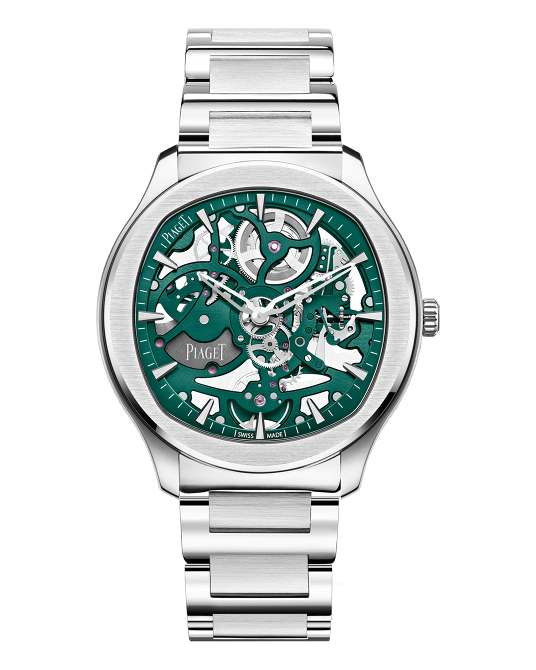 Push boundaries and never settle with the 42mm Piaget Polo Skeleton men’s luxury sports watch. This sports luxury watch upholds Piaget Polo design traditions with its classic cushion-shaped case, housing an ultra-thin self-winding movement. Mixing polish and satin-brushed finishes, this skeleton watch is a versatile creation that features an interchangeable strap, allowing you to switch from steel to green alligator leather at a whim. A sublime sapphire glass and bold green movement make this adaptable luxury watch a one-of-a-kind companion.
