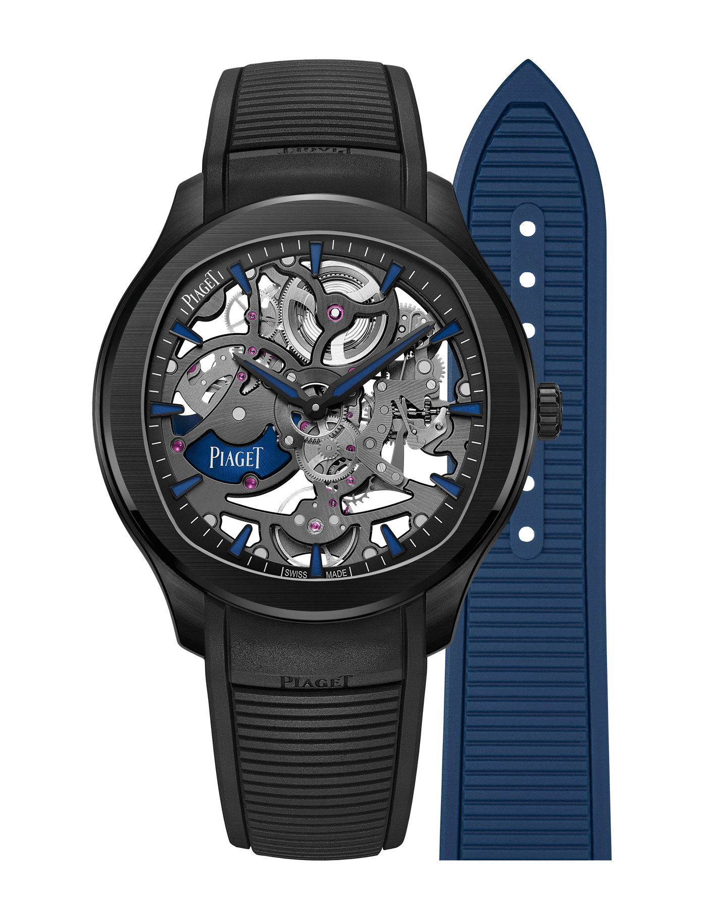 Piaget Polo skeleton watch, 42 mm. Case in black ceramic and titanium. Dial with SuperLumiNova® indexes and hands. Black rubber bracelet with Singletouch interchangeable system. Watch delivered with a second blue rubber strap. Steel and titanium folding buckle. Manufacture 1200S1 dark grey-hued automatic skeleton movement.