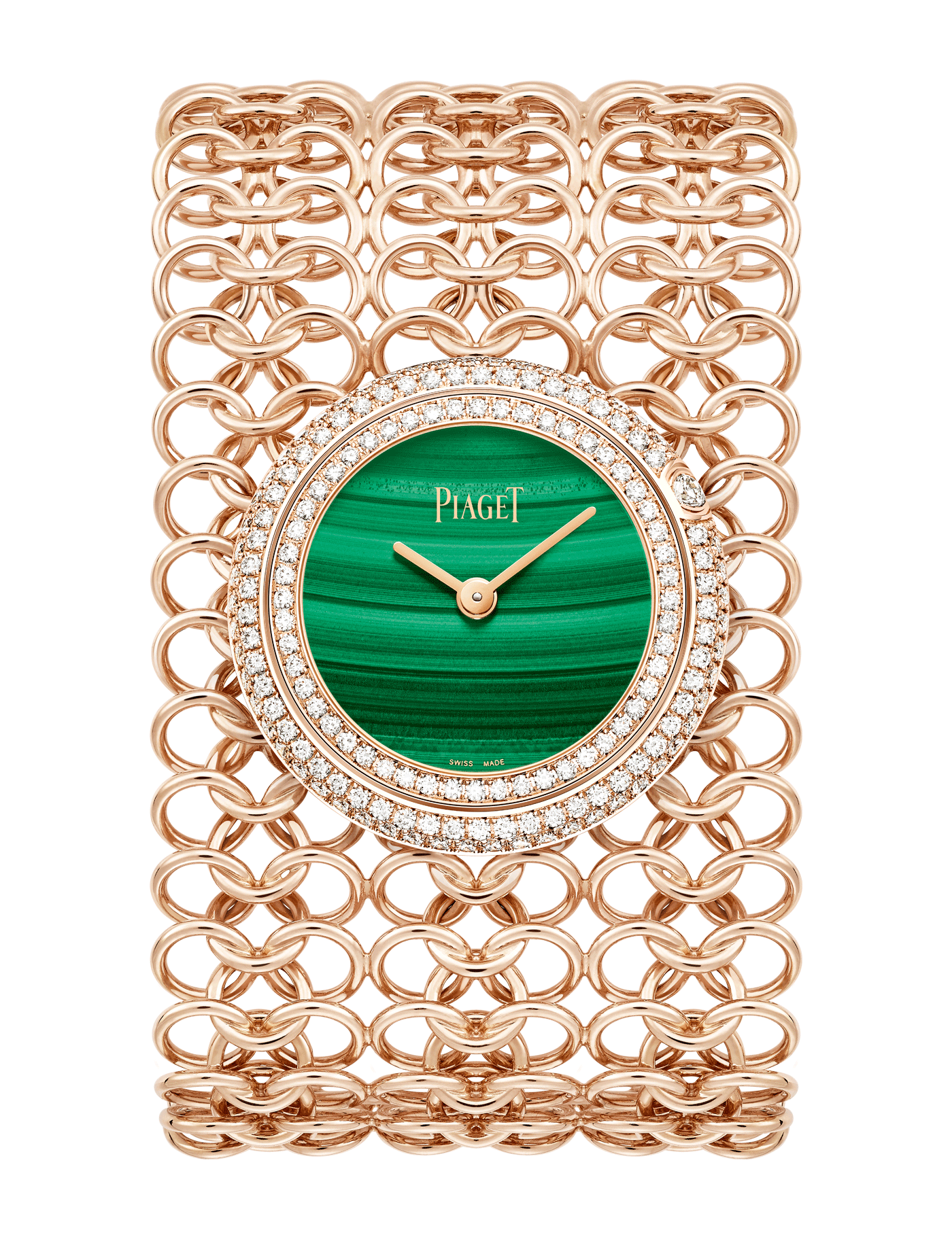 Possession cuff watch, 29 mm. Case in 18K rose gold set with 162 brilliant-cut diamonds (approx. 1.55 ct). Natural malachite dial set with 11 brilliant-cut diamonds (approx. 0.07 ct). Woven chain bracelet in 18K rose gold (bracelet width 39mm, and length 145mm). Piaget 56P quartz movement.
