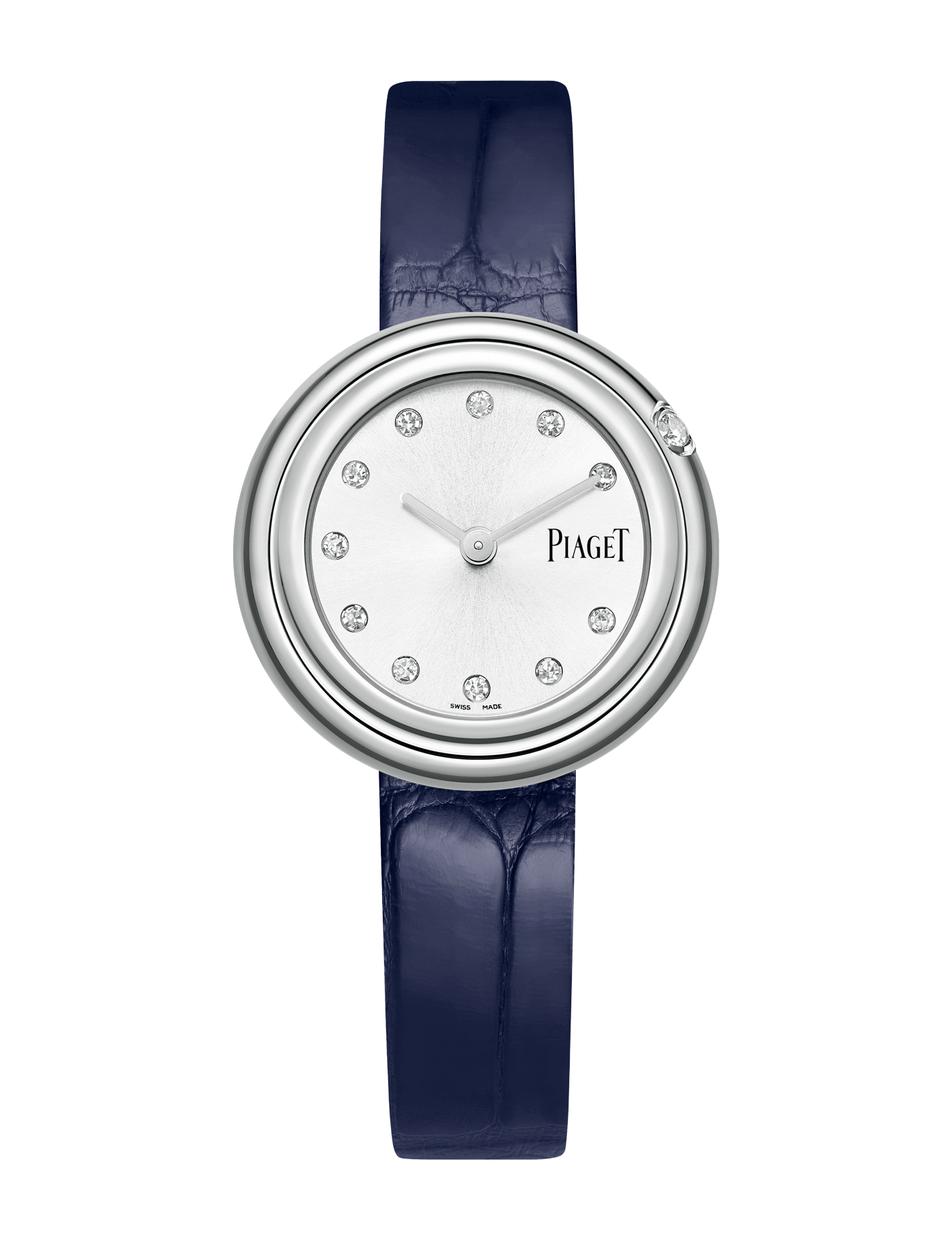 Possession watch, 29 mm. Case in steel set with one brilliant-cut diamond (approx. 0.05 ct). Dial set with 11 brilliant-cut diamonds (approx. 0.07 ct). Interchangeable light blue alligator strap. Piaget 358P quartz movement.