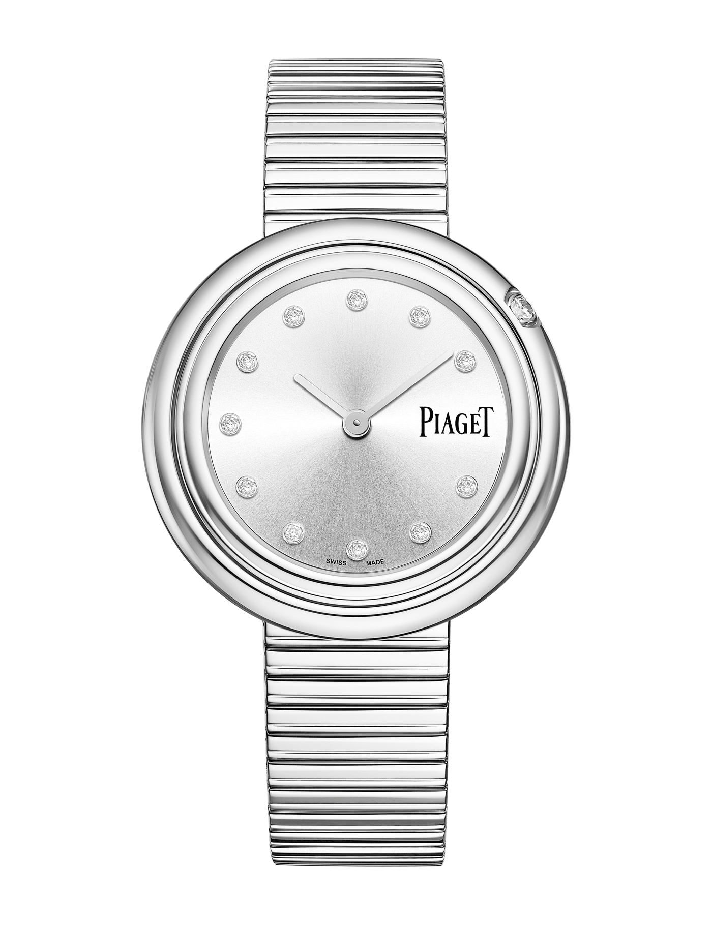 Possession watch, 34 mm. Case in steel set with one brilliant-cut diamond (approx. 0.06 ct). Silver dial set with 11 brilliant-cut diamonds (approx. 0.09 ct). Interchangeable strap. Piaget 358P quartz movement.