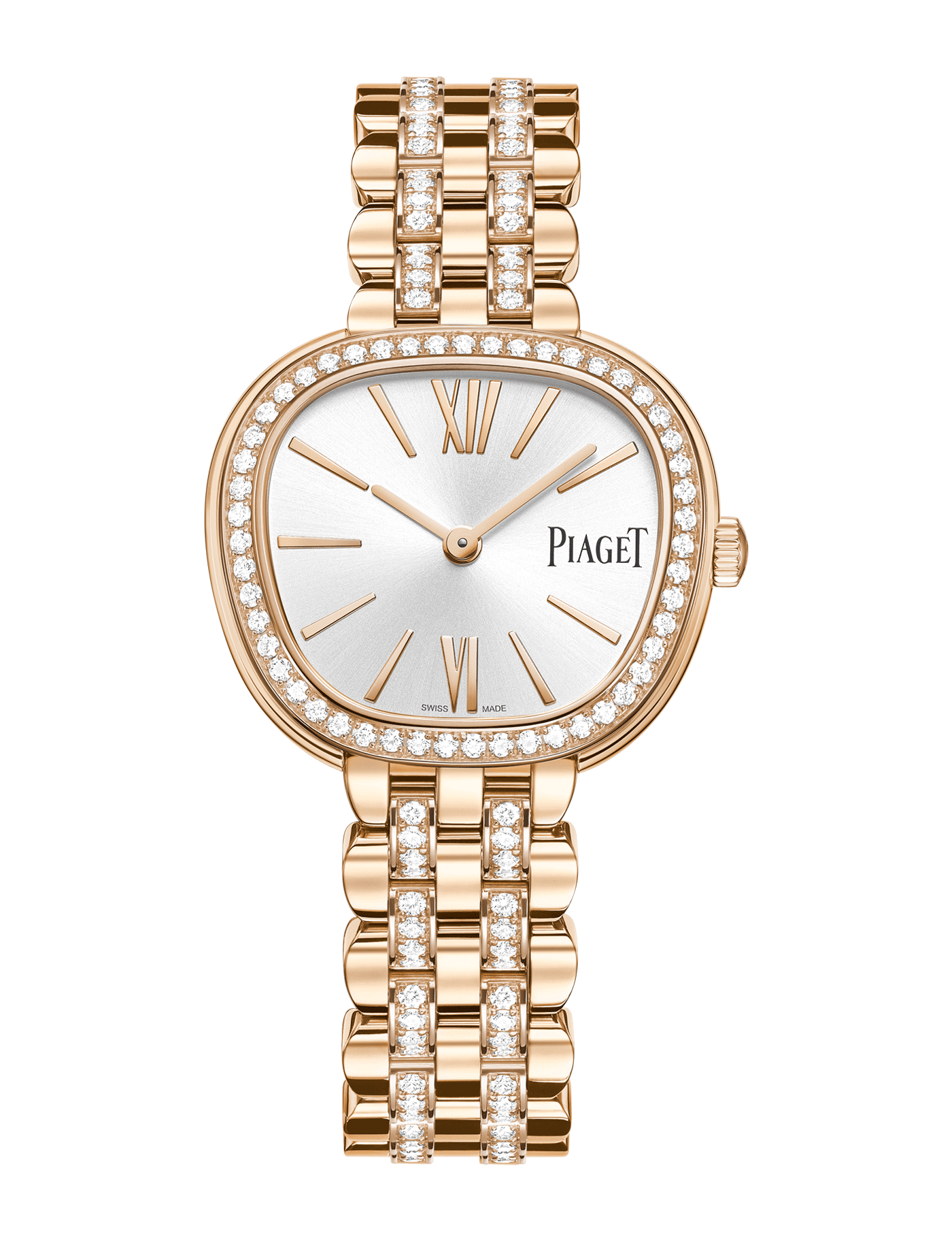 Sixtie watch, 29 mm. Trapeze-shaped case in 18K rose gold set with 51 brilliant-cut diamonds (approx. 0.52 ct). Silvered solar satin-brushed dial. Bracelet in 18K rose gold semi-set with 176 brilliant-cut diamonds (approx. 1.81 cts). Piaget 57P quartz movement.