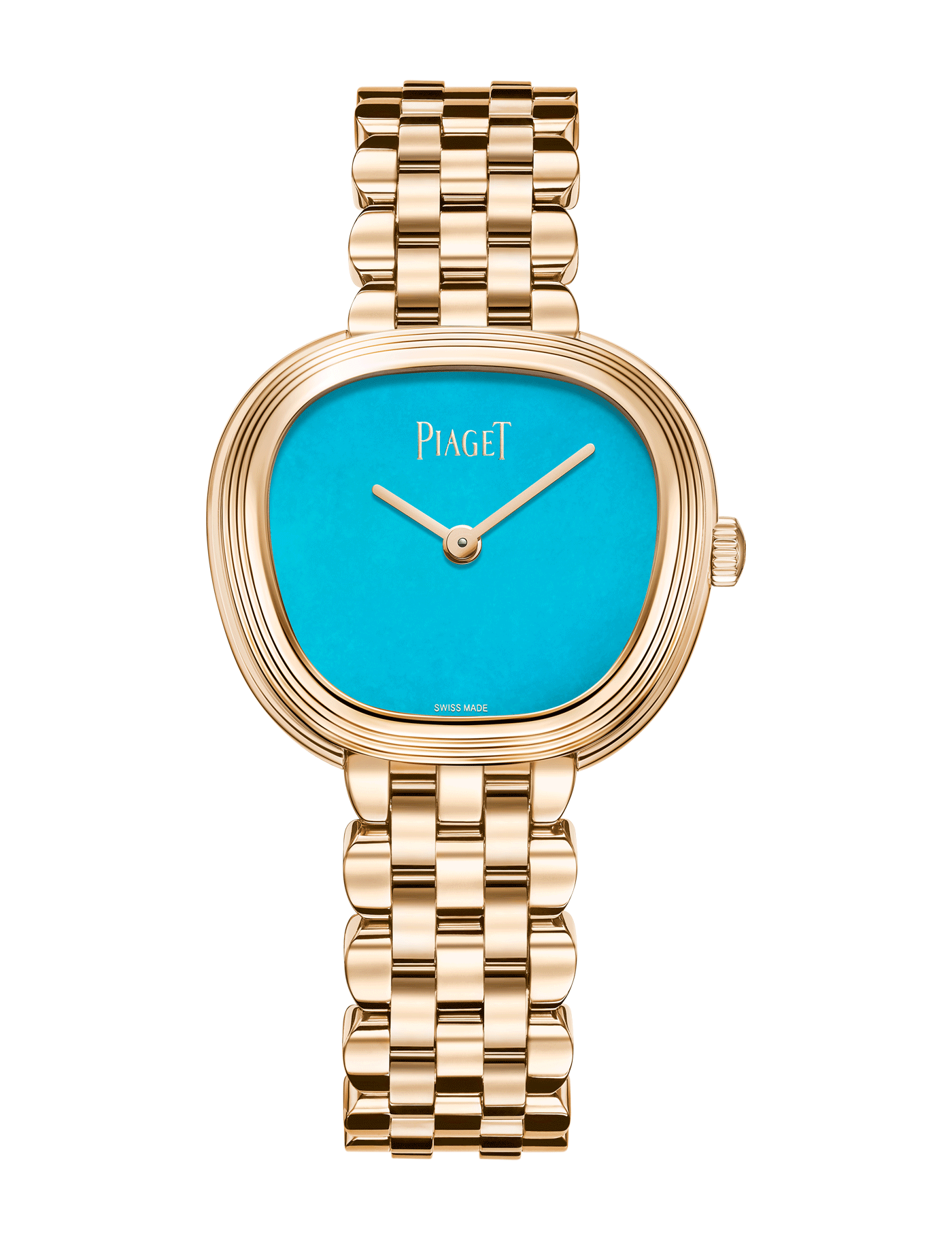 Sixtie watch, 29 mm. Trapeze-shaped case in 18K rose gold. Turquoise dial. Bracelet in 18K rose gold. Piaget 57P quartz movement.
