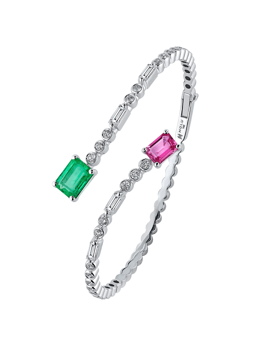 Today's Princess Pırlantalı Zümrüt ve Pembe Safirli 18 Ayar Beyaz Altın Kelepçe Bilezik