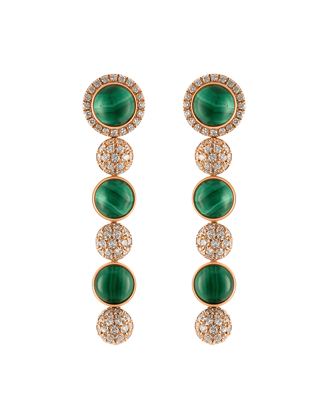 Tropica Colors Pırlantalı Malahitli 18 Ayar Pembe Altın Üç Taşlı Sallantılı Küpe